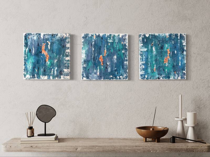 Tecnica mista acrilico con fogli oro rosa su tre tele 30x30 cm